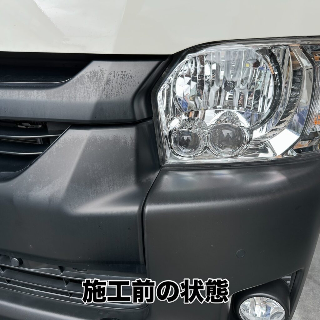もともと、お車の素地バンパーやグリルが経年劣化で痩せ、白っぽく見えてきてしまったのがずっと気になっていたとのこと。そんな時、弊社のYouTubeをご覧になり、「まさにこれだ!」と運命を感じてご連絡をいただきました。